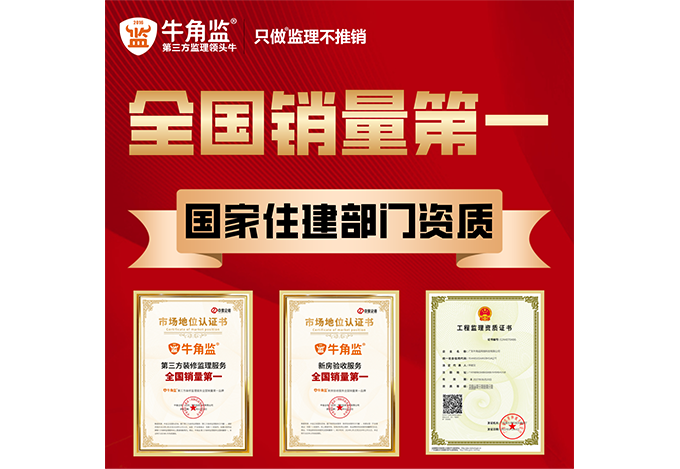 广东牛角监网络科技有限公司成立于2016年,是一家在国家住建部公告,受到国家相关法律法规保障和认可的权威装修监理企业。牛角监以“让天下装修没烦恼”作为公司使命,以“只做监理不推销”为行动原则,是第三方装修监理行业的开创者和市场的霸冠者。牛角监的服务范围覆盖了全国主要的一、二线城市。牛角监第三方装修监理和新房验收双项服务,全国销量第一。牛角监经国家统计局授权的市场权威调查与研究咨询机构根据2024年度数据调研确认:牛角监荣获“第三方装修监理服务全国销量第一”和“新房验收服务全国销量第一”的双重认证,进一步彰显了牛角监在行业的领头牛地位。牛角监,资质更硬,更权威,受法律保障。牛角监拥有国家住建部门颁发的,在中华人民共和国城乡和住房建设部官方网站公告的“全国房屋建筑工程乙级监理资质”、“全国市政公用工程乙级监理资质”,以及“全国装修装饰甲级监理资质”。是装修监理行业惟一一家拥有三大齐全资质的装修监理公司。牛角监的相关监理资质以及监理结果权威受到《中华人民共和国建筑法》、《中华人民共和国城市房地产管理法》、《建筑工程质量管理条例》等国家及地方法律法规的保障和认可。牛角监,只做监理不推销。牛角监不同于装修监理行业普遍把监理客户当成流量资源,从而向客户推销建材家居各类产品的商业模式。牛角监以“只做监理不推销”核心原则,只聚焦于装修监理业务,决不向客户推销任产品,坚决反对任何可能产生影响第三方监理公平、公正角色的行为。牛角监,奥运冠军联袂代言。2024年,牛角监聘请了奥运冠军陈颖等五位冠军,作为企业的形象代言人。充分展示了牛角监专注于第三方监理,不做任何推销的准则。更体现了牛角监在行业中的地位。牛角监始终坚持“让天下装修没烦恼”企业使命,坚定客户方角色,为用户提供收房验房、审核报价、施工巡检、节点验收、竣工验收、工程量核算、材料核验、环保监测等监理服务,坚持监理标准化、过程透明化、执行预警化、管理实时化的理念,用心做服务,极力为客户创造舒心的装修过程和完美的装修结果。牛角监持续地为客户创造价值,促进装修行业的健康发展。