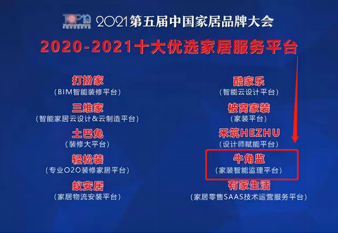 2021年:牛角监上海、杭州、成都等城市监理服务在2021年相继开通。牛角监为了更好的保护装修业主的隐私保障,率先升级小程序加密客户手机号码,为业主隐私重装防火墙。与此同时,在“2020-2021中国家居服务十大优选品牌”中,牛角监连续2年作为唯一一家监理工程类企业荣获上榜。8月,天猫牵手牛角监发力家装行业 独家首推“喵监理”品牌服务。牛角监作为天猫的第三方监理服务供应商,天猫通过采购牛角监的监理服务,为天猫的客户提供更加专业和独立装修监理服务。
