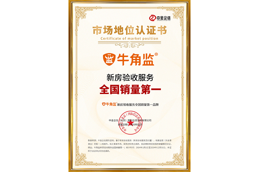 2025年:牛角监获得权威认证,第三方装修监理服务和新房验收服务同时获得全国销量第一,成就遥遥领先的市场地位。