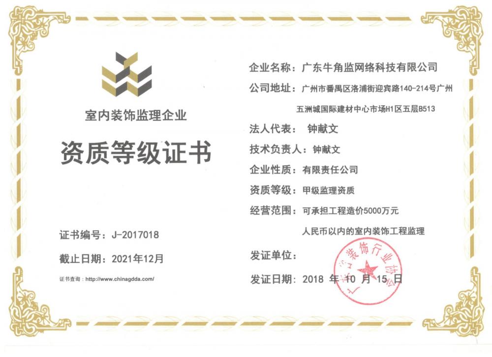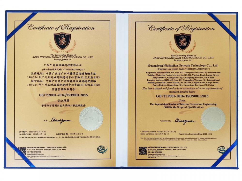 2019年:牛角监通过了国际ISO9001质量管理体系认证,这标志着牛角监的管理水平已经达到装修监理行业的较高水准,同时牛角监也是装修监理行业首家获得该认证的企业。 与此同时,牛角监获得了由广州市市场监督管理局颁发的“2019年度广东省守合同重信用企业”荣誉称号。同年,牛角监成功开通了郑州等城市的监理服务,越来越多的业主认可并购买了牛角监的监理服务。牛角监装修监理团队以专业的管家式服务,获得了广大客户好评。牛角监为广大业主审核装修预算、验收装修材料、监督施工进程、装修竣工验收,实实在在地为业主解决了许多专业性的难题,在保卫了装修的品质同时,也让装修更省钱、省时、省心、省力。